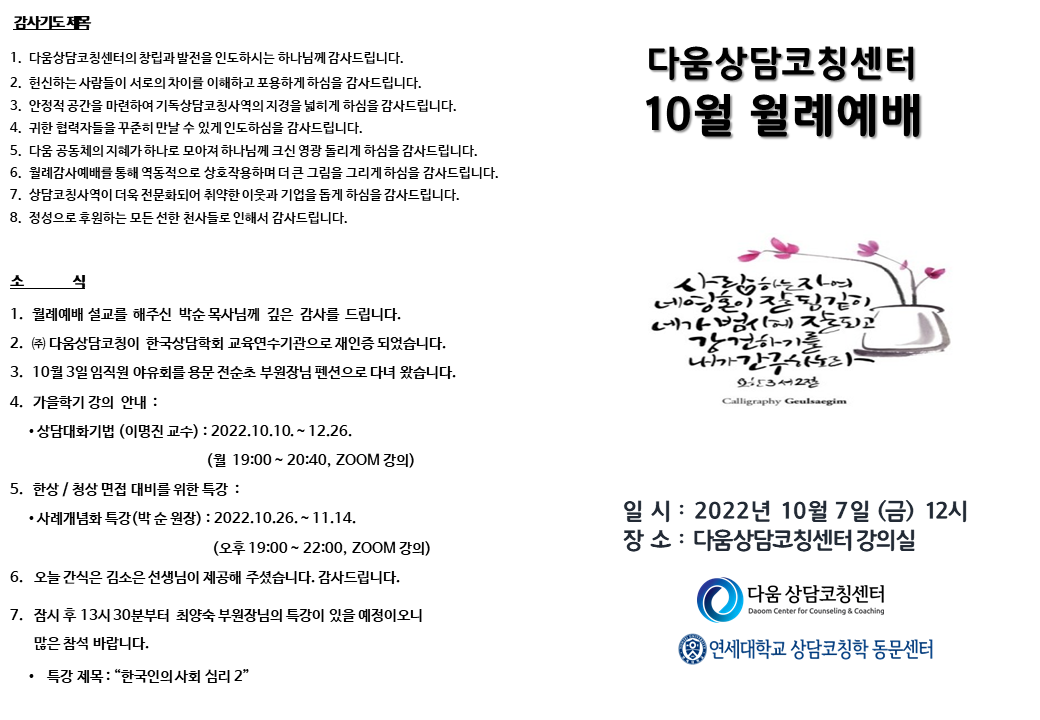 < 다움상담코칭센터 10월 월례예배 및 특강 안내 >